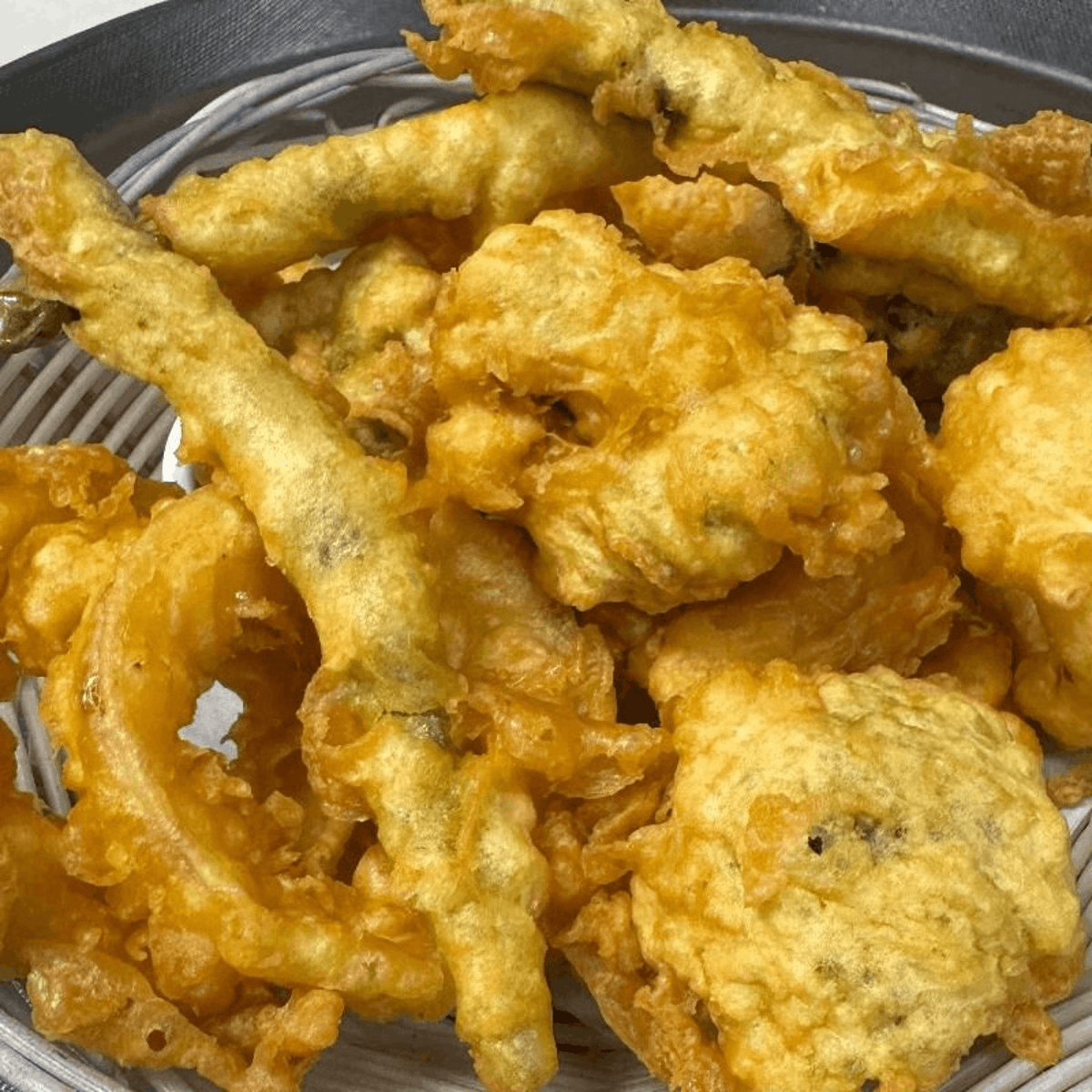Recommended for a vegetarian dish. Soft white tofu battered until crispy, topped with assorted fresh vegetables