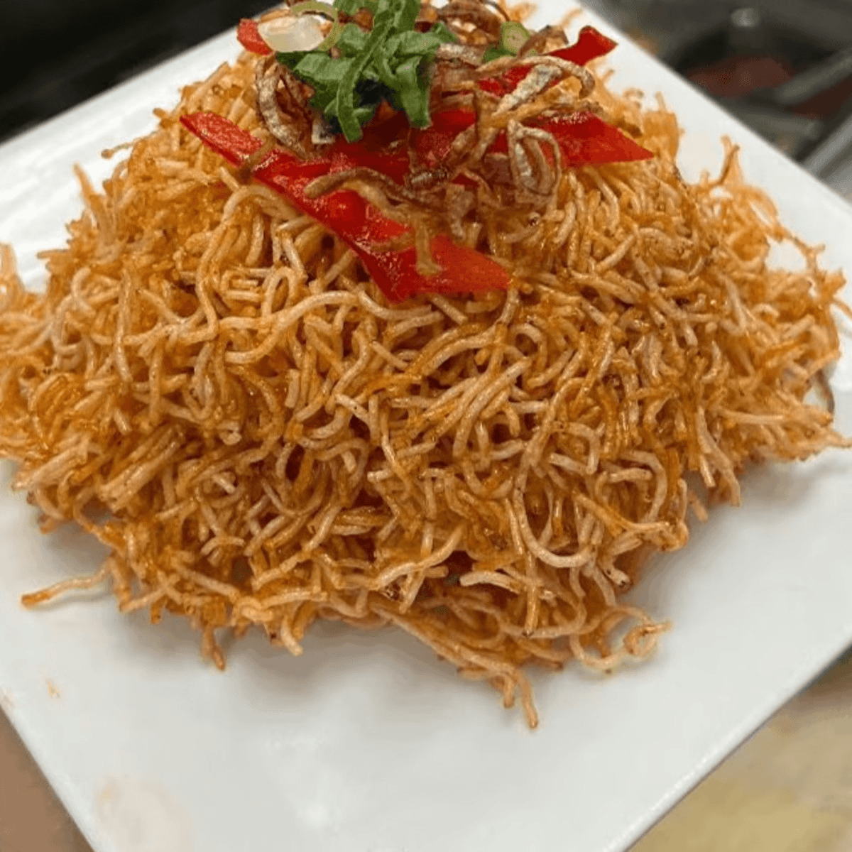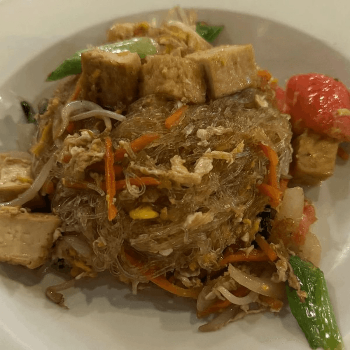Stir-fried bean thread noodles with bean sprouts, egg, tomatoes, carrots and onions. Your choice of: Chicken, pork, tofu, (for additional charge: beef, ground chicken or shrimp)
