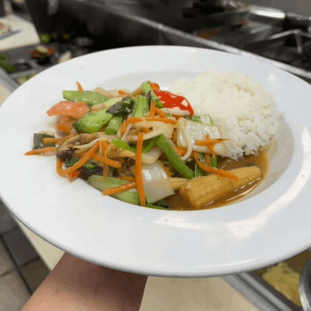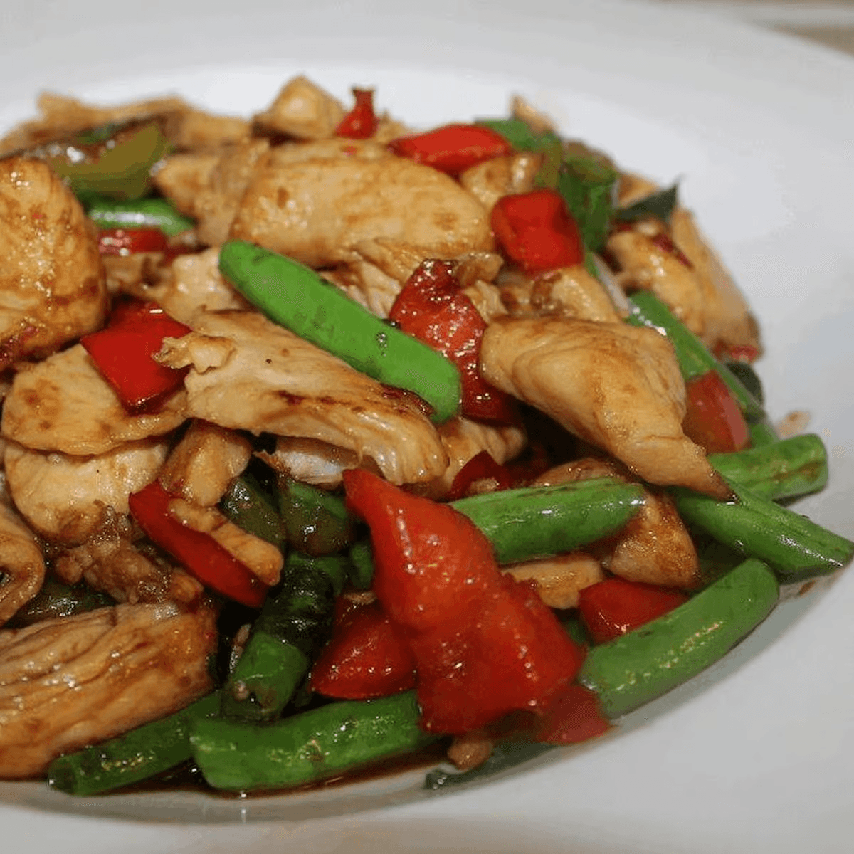 Sweet basil leaves, hot peppers, green beans and stir-fried with rice in our homemade sauce