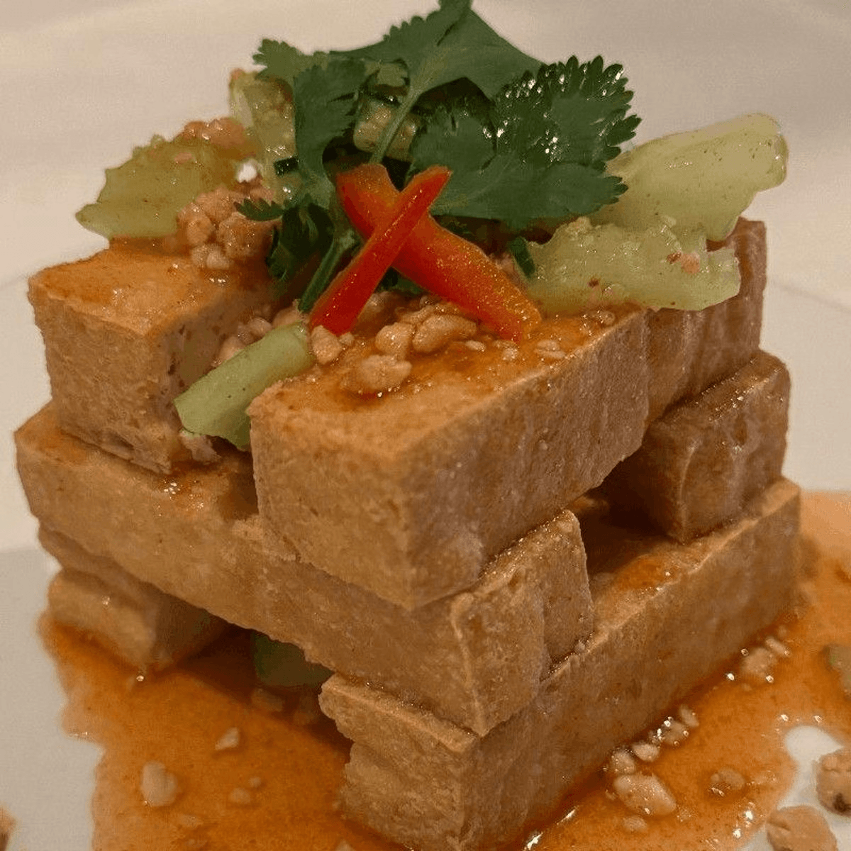 Soft white tofu battered until crispy, topped with mushroom baby bok-choy, carrot, Pea pod, recommended for vegetarian dish