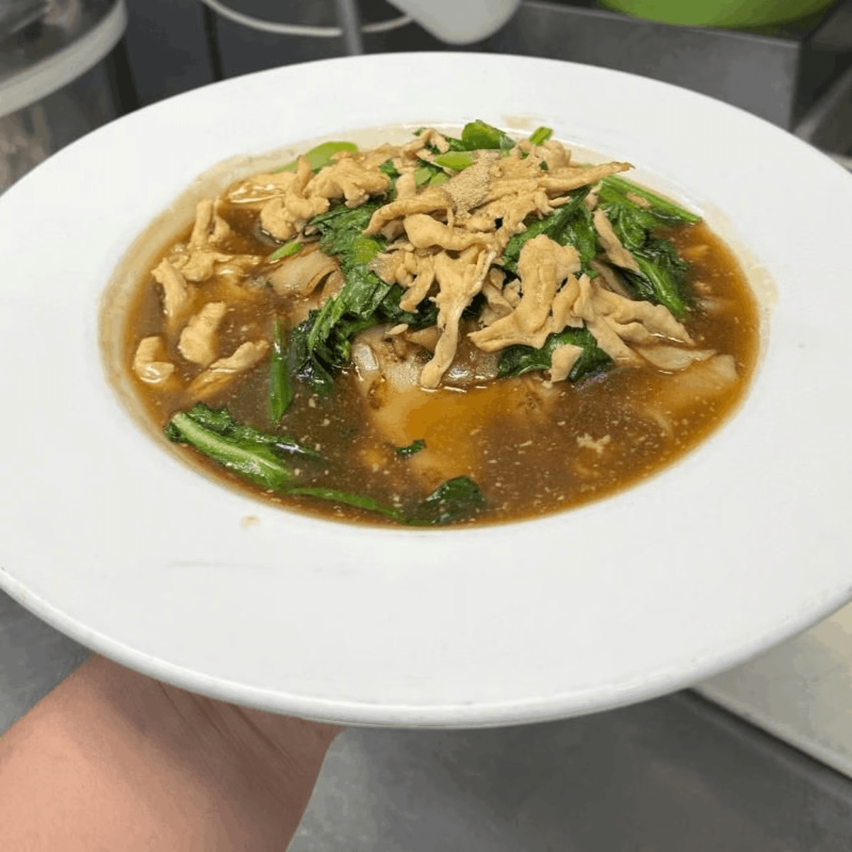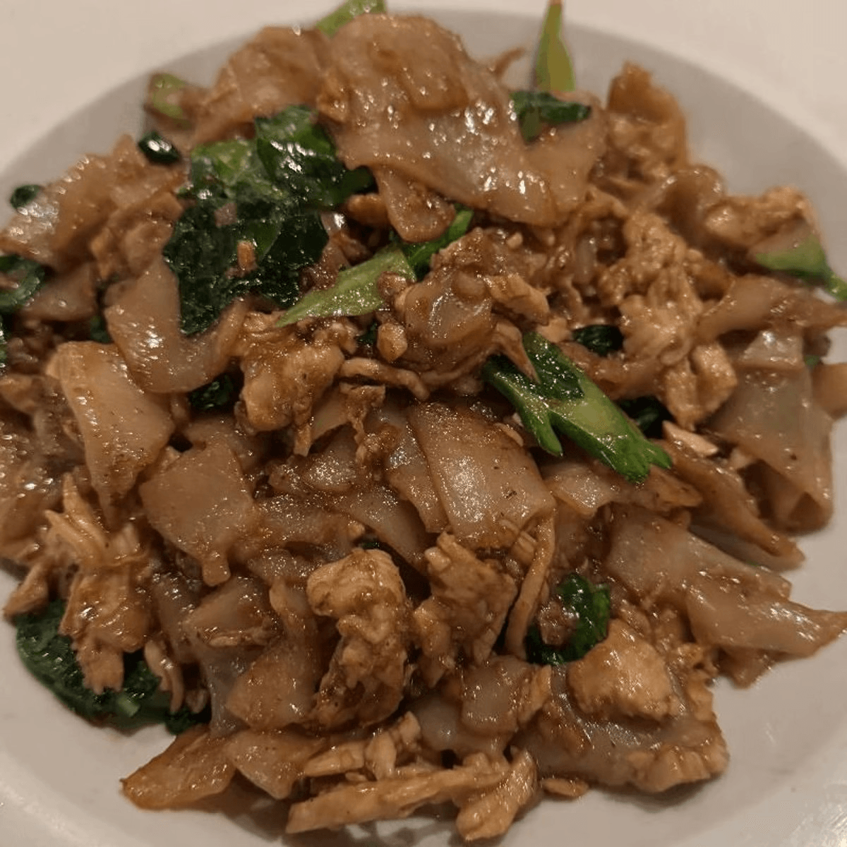 Thai style big flat rice noodles, Chinese broccoli, and egg, stir-fried with sweet soy sauce
