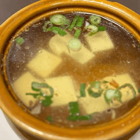 Bean curd cakes in a clear broth, topped with a scallion