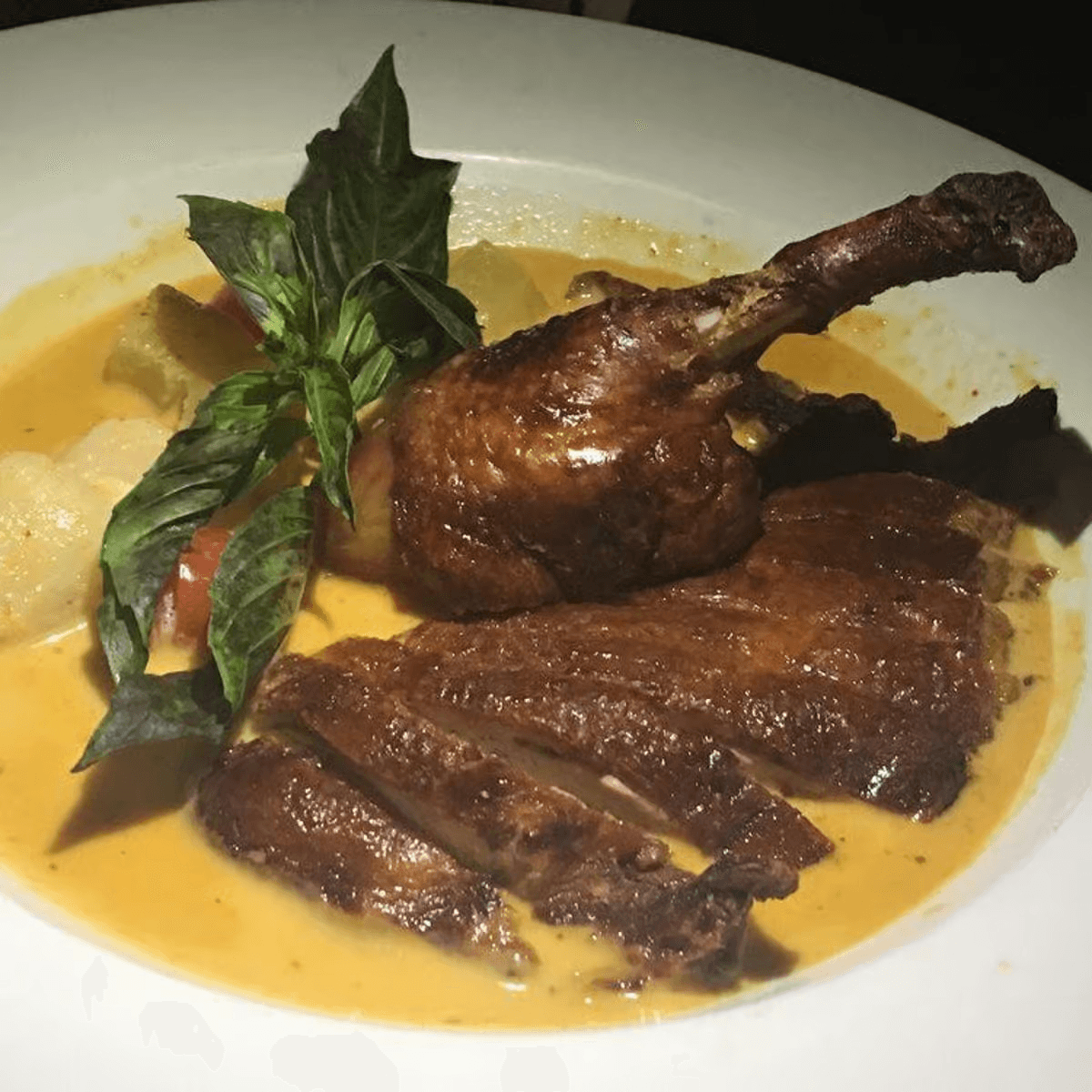 Duck breast slowly roasted, juicy and golden brown, topped with our house special lychee, pineapple and red curry sauce