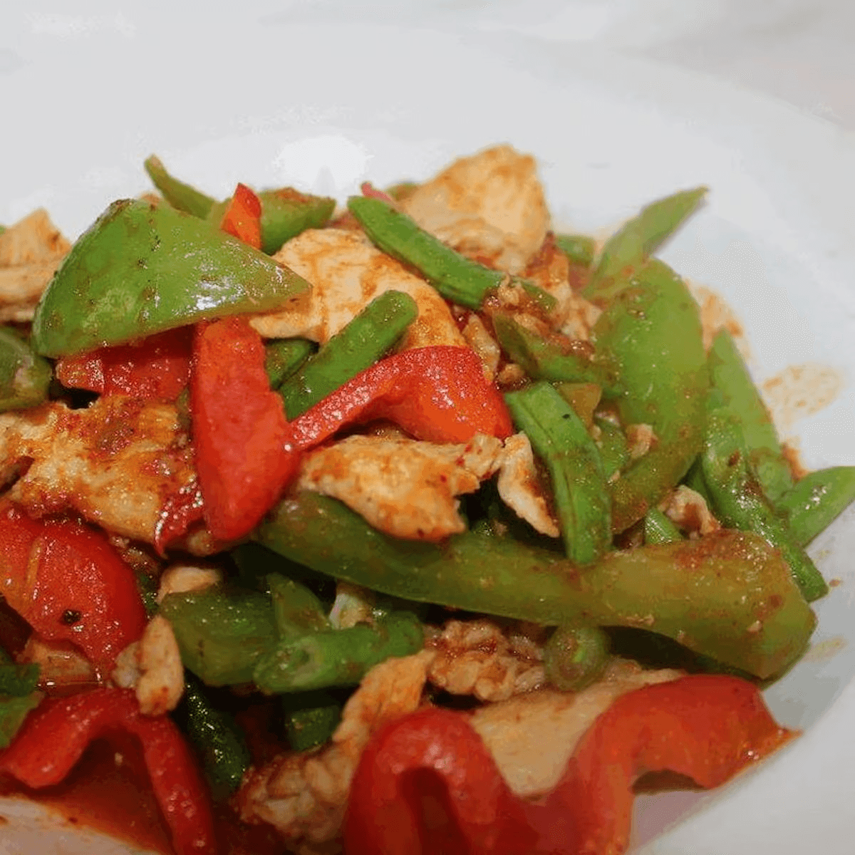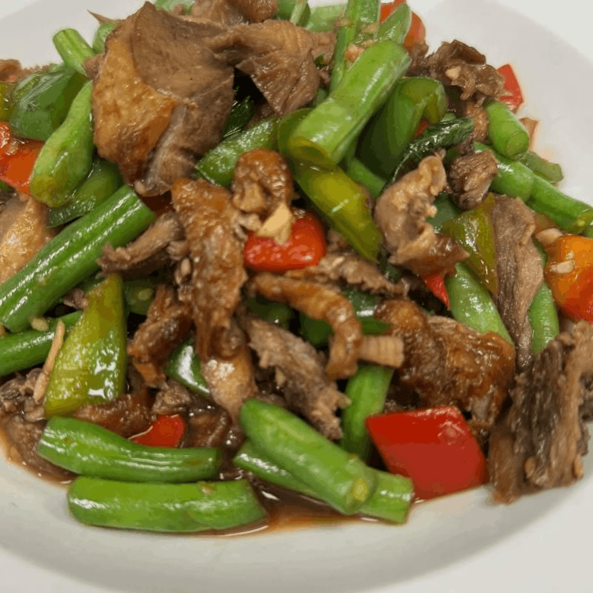 Sliced duck meat stir-fried with bamboo, string beans, bell pepper, hot pepper in a spicy sauce