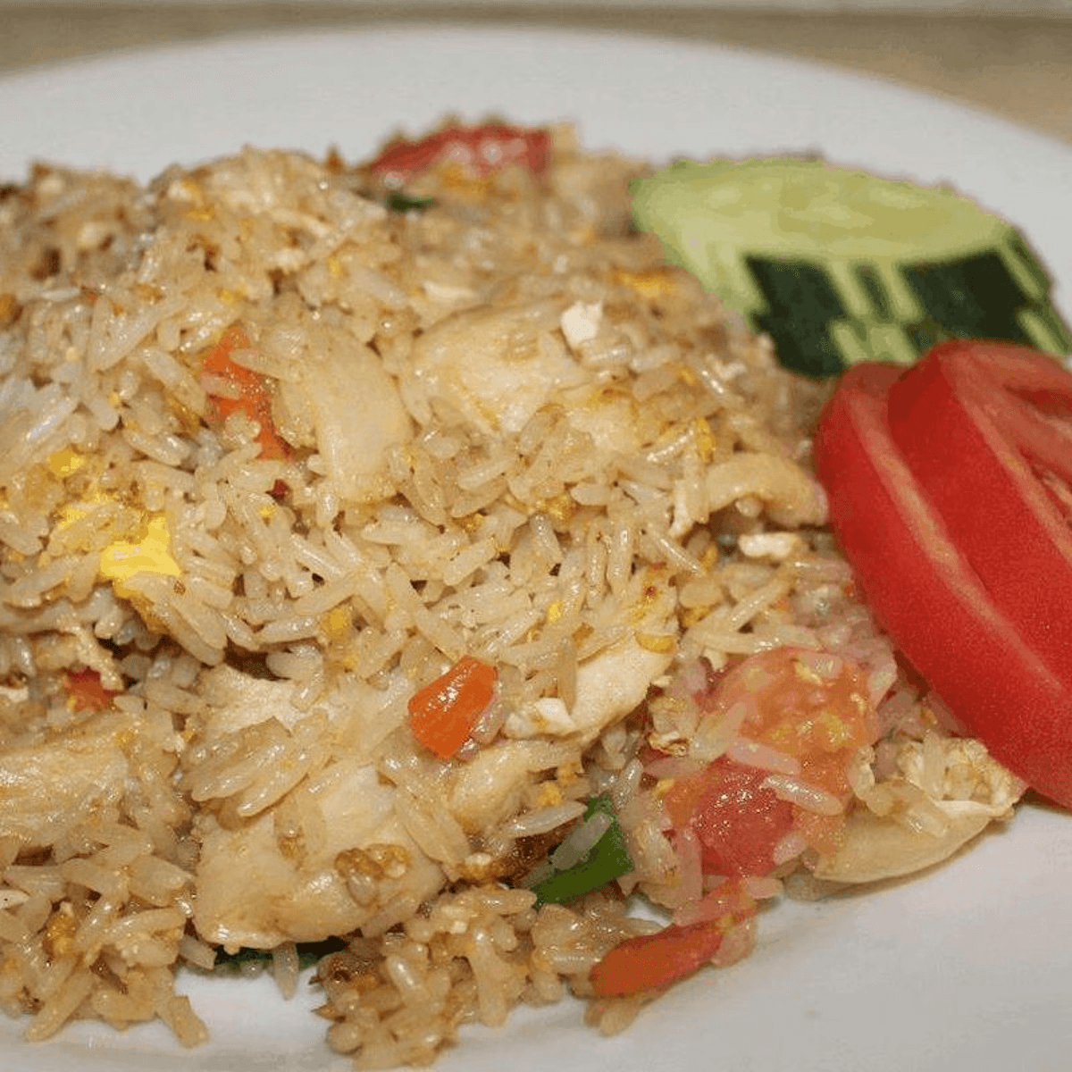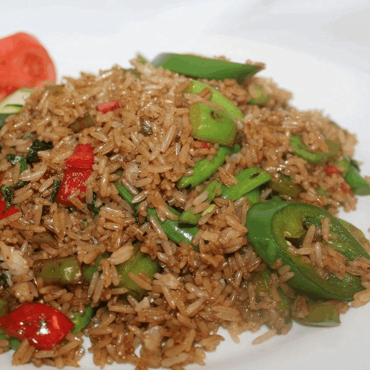 Stir-fried rice with tomatoes, onions, carrots and egg in our homemade sauce