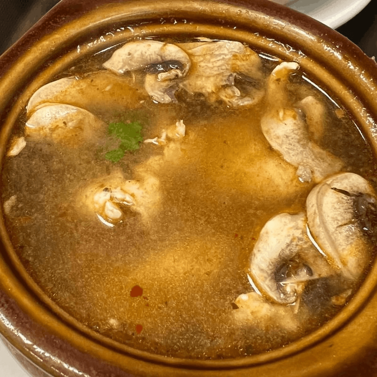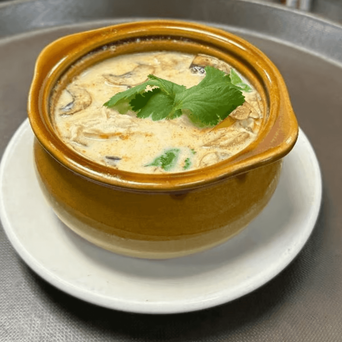 A delightful creamy soup with coconut milk, mushrooms, tomatoes, fragrant, and an elusive flavor of galangal