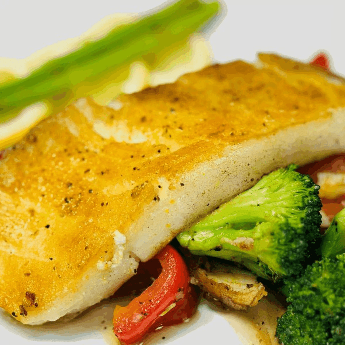 Pan seared Chilean sea bass topped with special lemon pepper seasoning, served with sautéed broccoli, red bell pepper and white onion