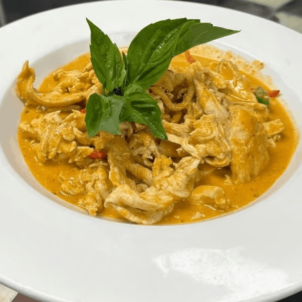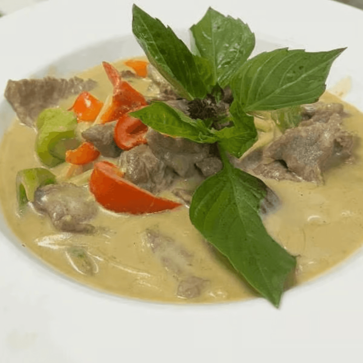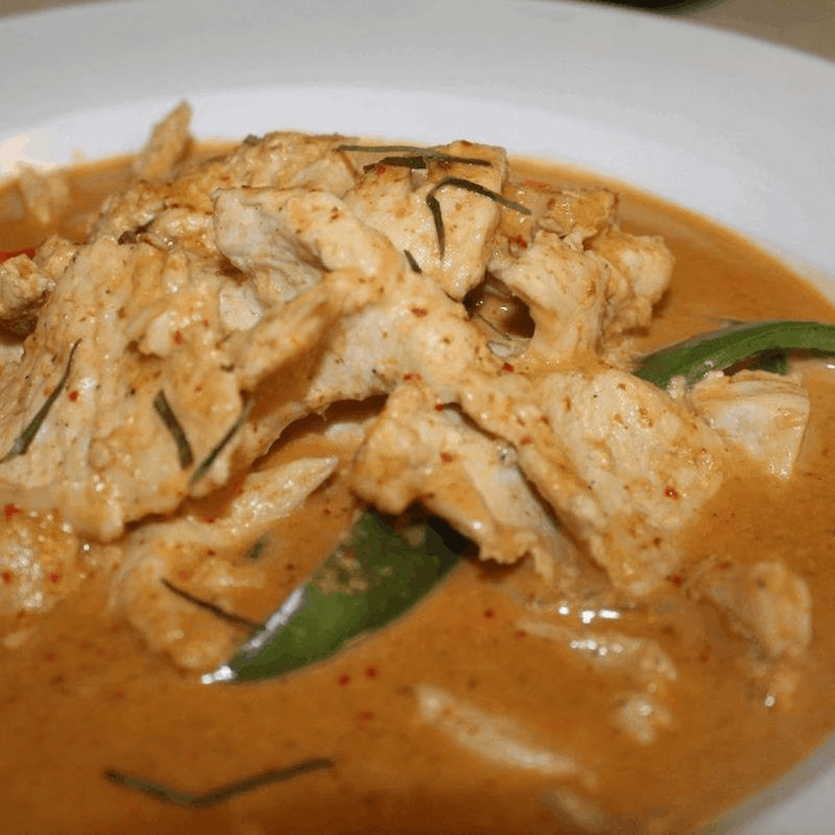Spicy. Grilled seasoned beef tenderloin, served over Panang curry sauce