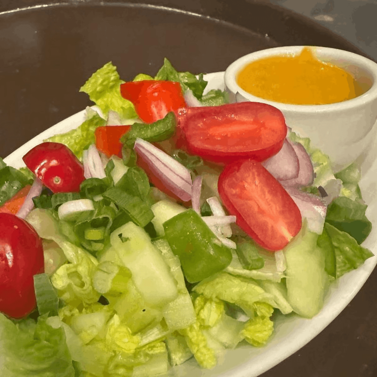 Fresh spring mix, cucumbers and tomatoes with house ginger dressing