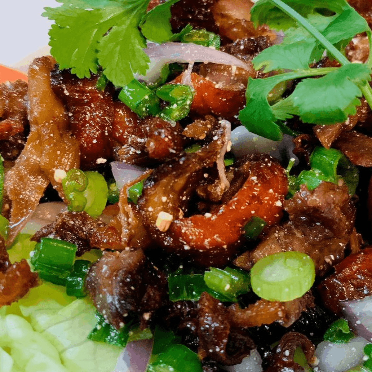 Roast duck mixed with rice powder, onions and lime juice. Served with lettuce