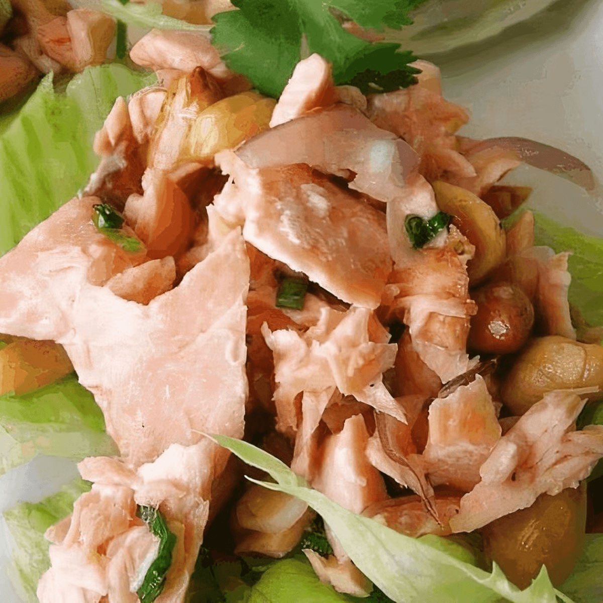 Pan-fried salmon chopped and mixed with peanuts, shallots and ginger, in homemade sauce. Served on fresh lettuce