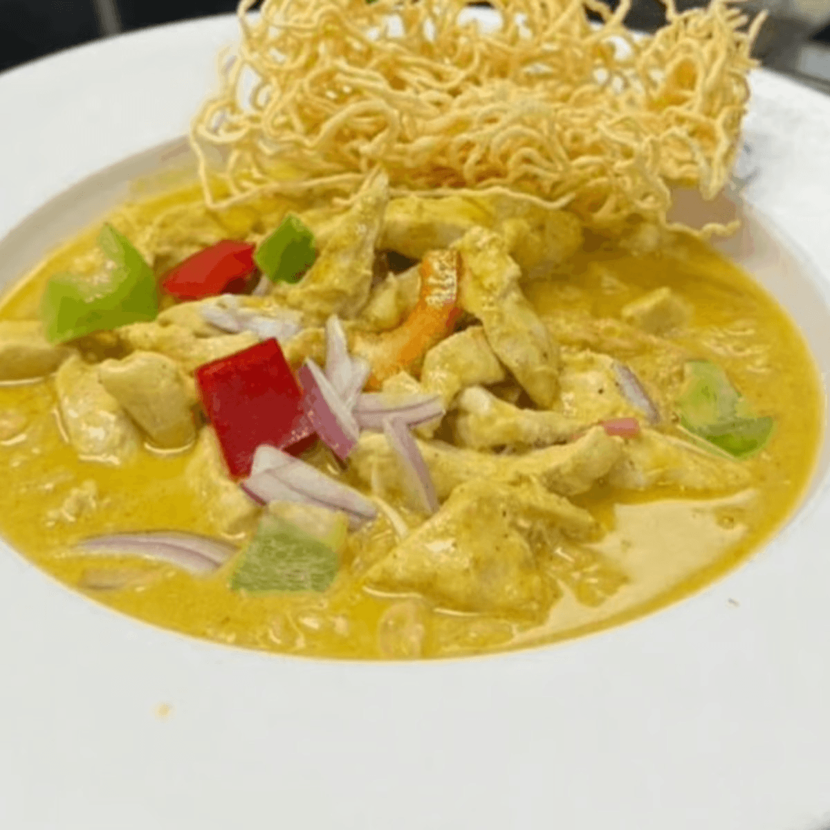 Northern Thai coconut curry noodles. Rich and creamy yellow curry broth with boiled and fried noodles red onion diced bell pepper. Spicy. Your choice of: Chicken, pork, tofu, (for additional charge: beef, ground chicken or shrimp)