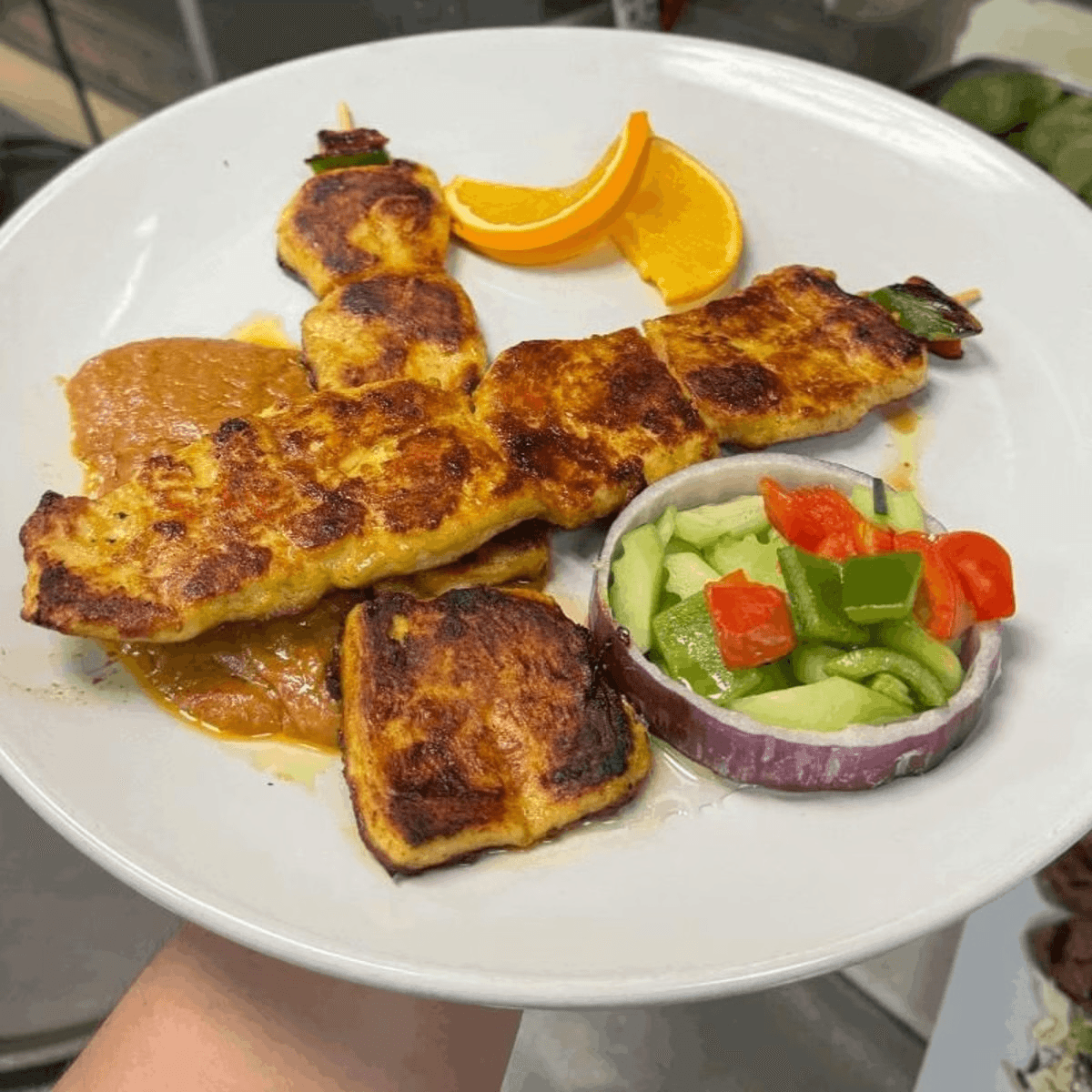 2 pieces. Grilled marinated chicken served with our own delicious peanut sauce. Complemented with a cucumber salad