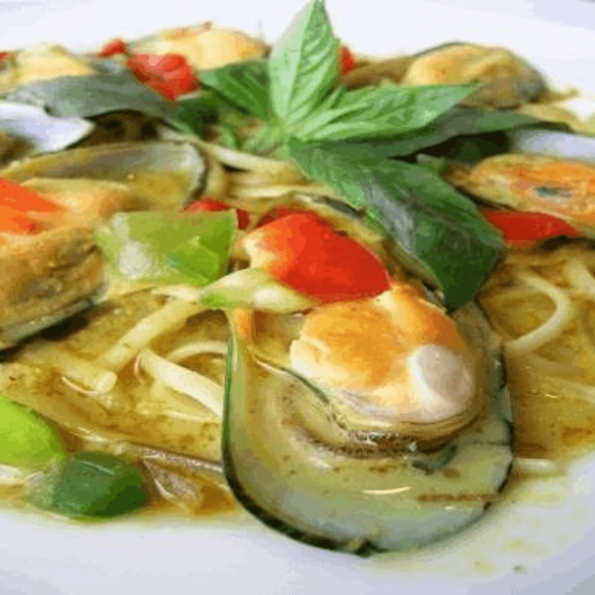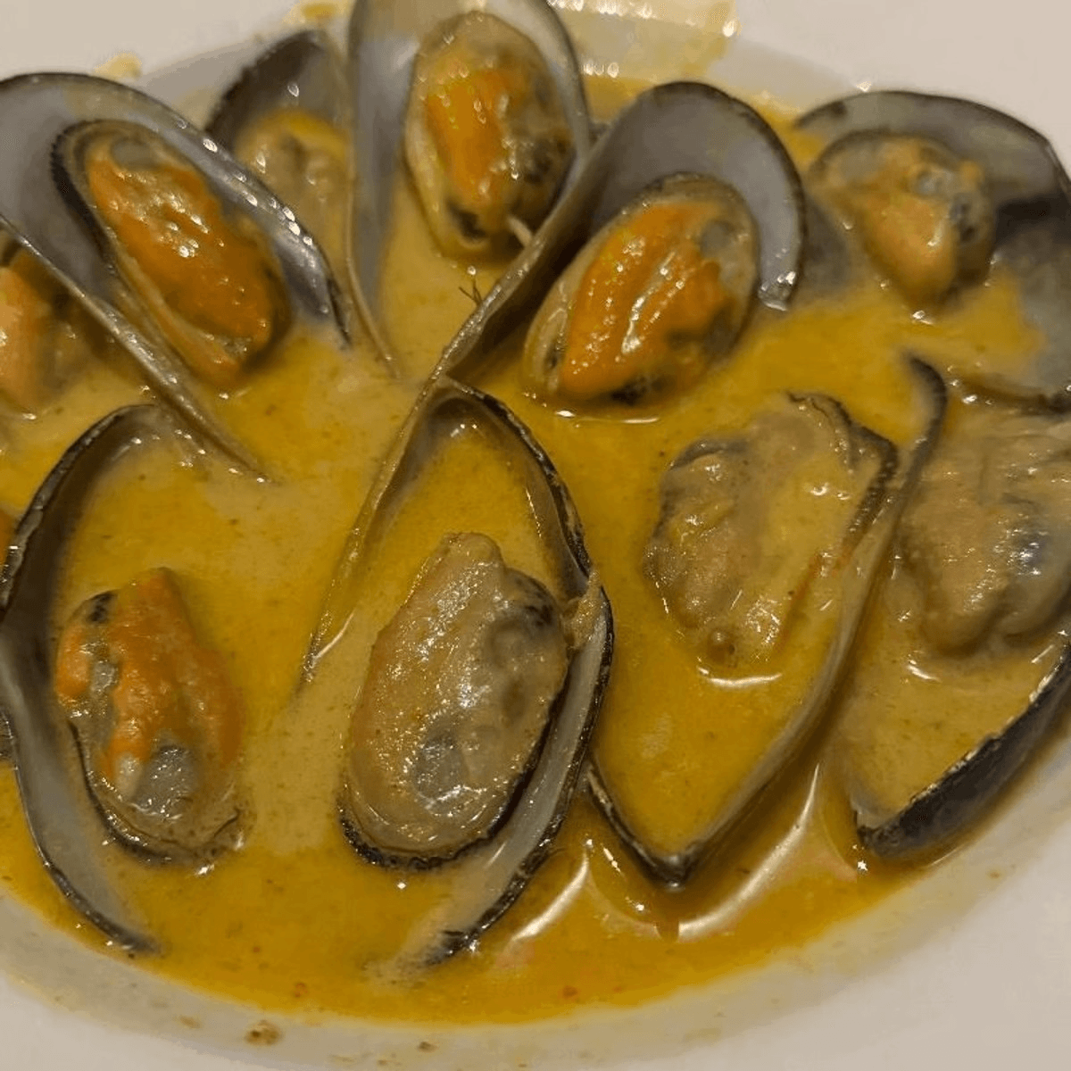 Steamed New Zealand green mussels in yellow curry sauce served with linguine pasta. Spicy