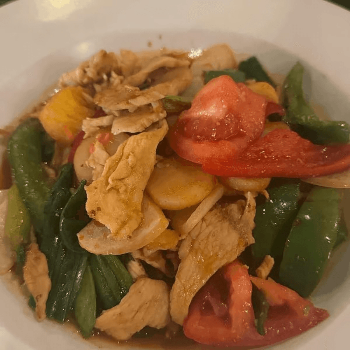 Onions, pineapple, tomatoes, bell peppers and peapods, in sweet and sour sauce.