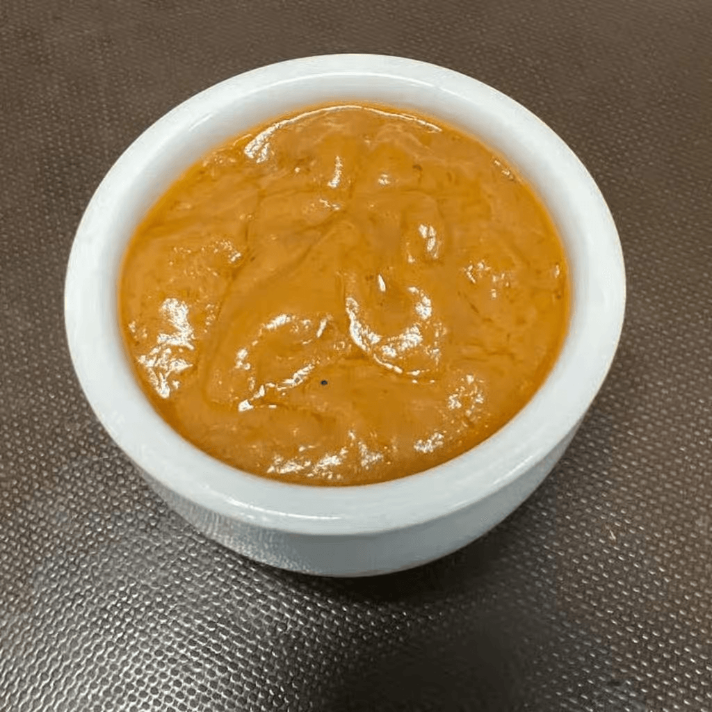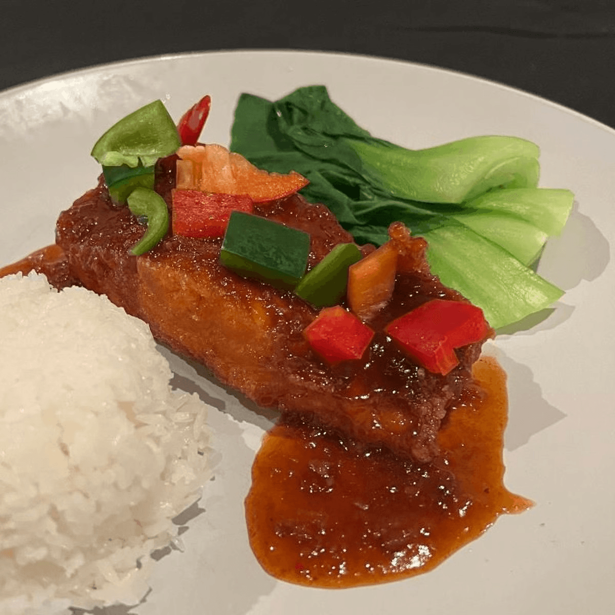 Medium spicy. Sautéed salmon fillet, topped with a three flavor sauce