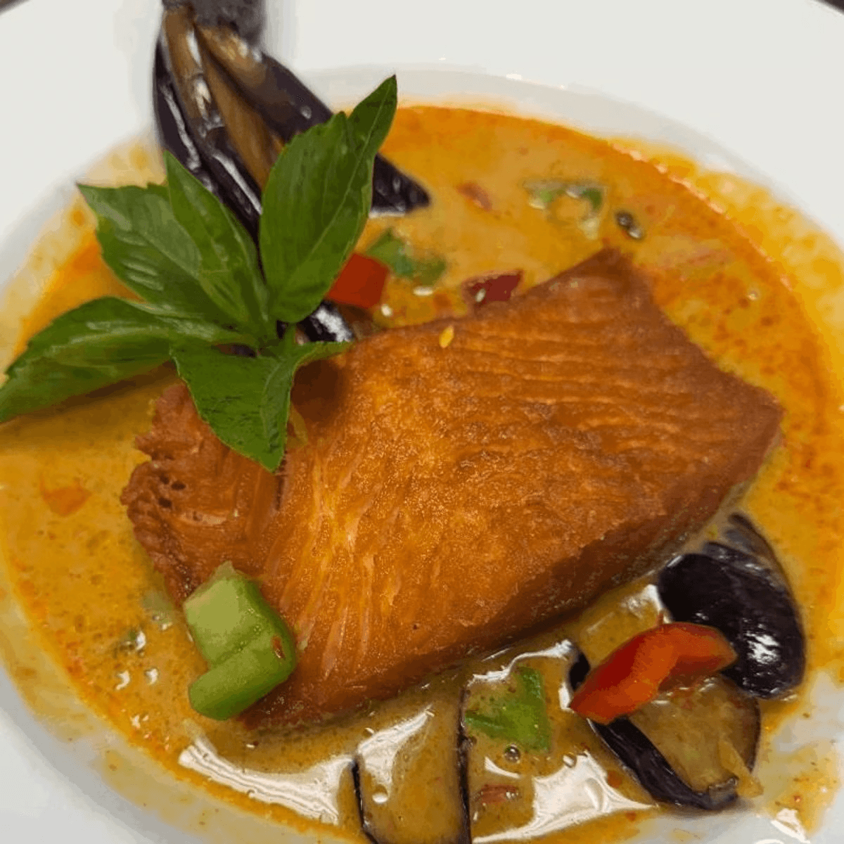 Pan-fried fillet of salmon and eggplant, served over red curry sauce