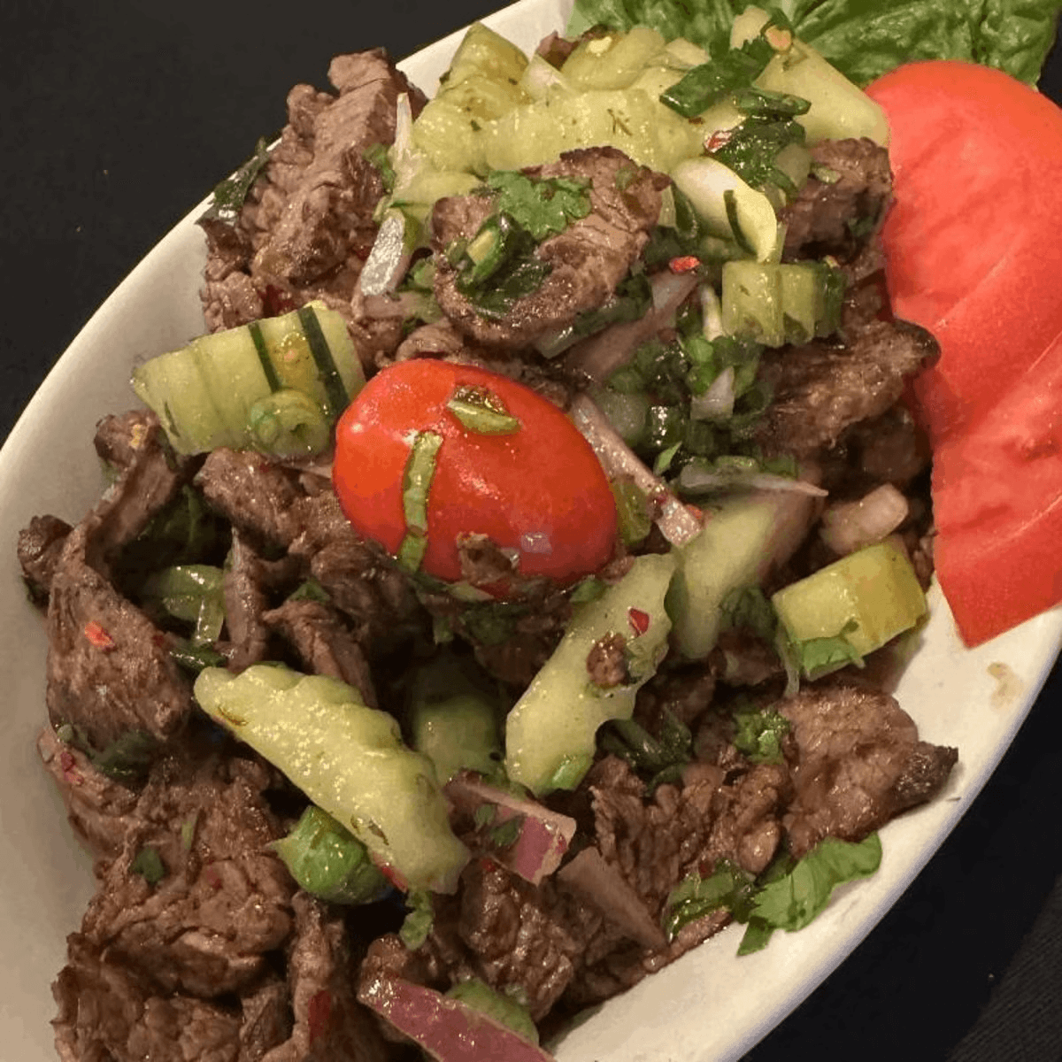 Spicy. Grilled beef spiced with chili peppers, tomatoes, onions, cucumbers and lettuce in a lime-based dressing