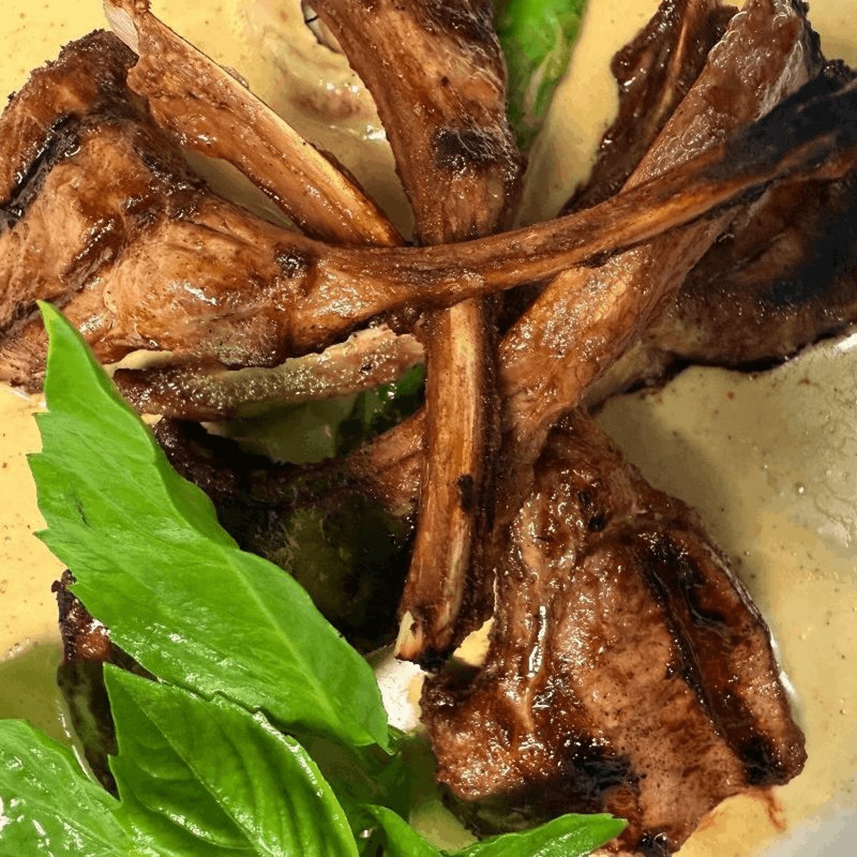 Spicy. A selected rack of New Zealand lamb marinated in light curry sauce, grilled to perfection. Topped with green curry sauce. Served with white rice