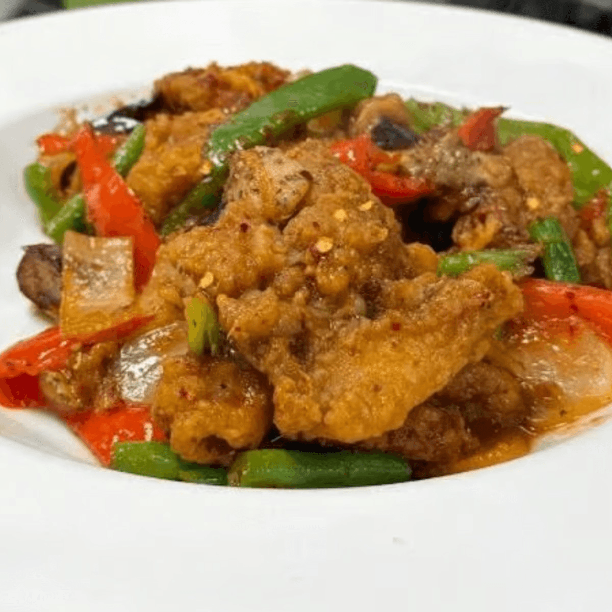 Live jumbo soft-shell crab, battered and fried until a light crisp and sautéed with black pepper sauce. Served with house fried rice