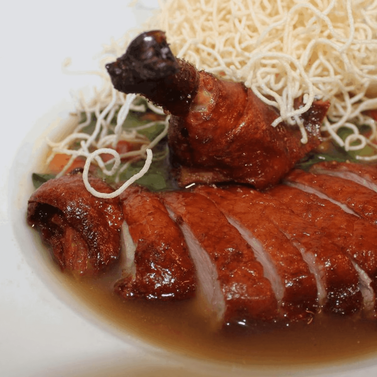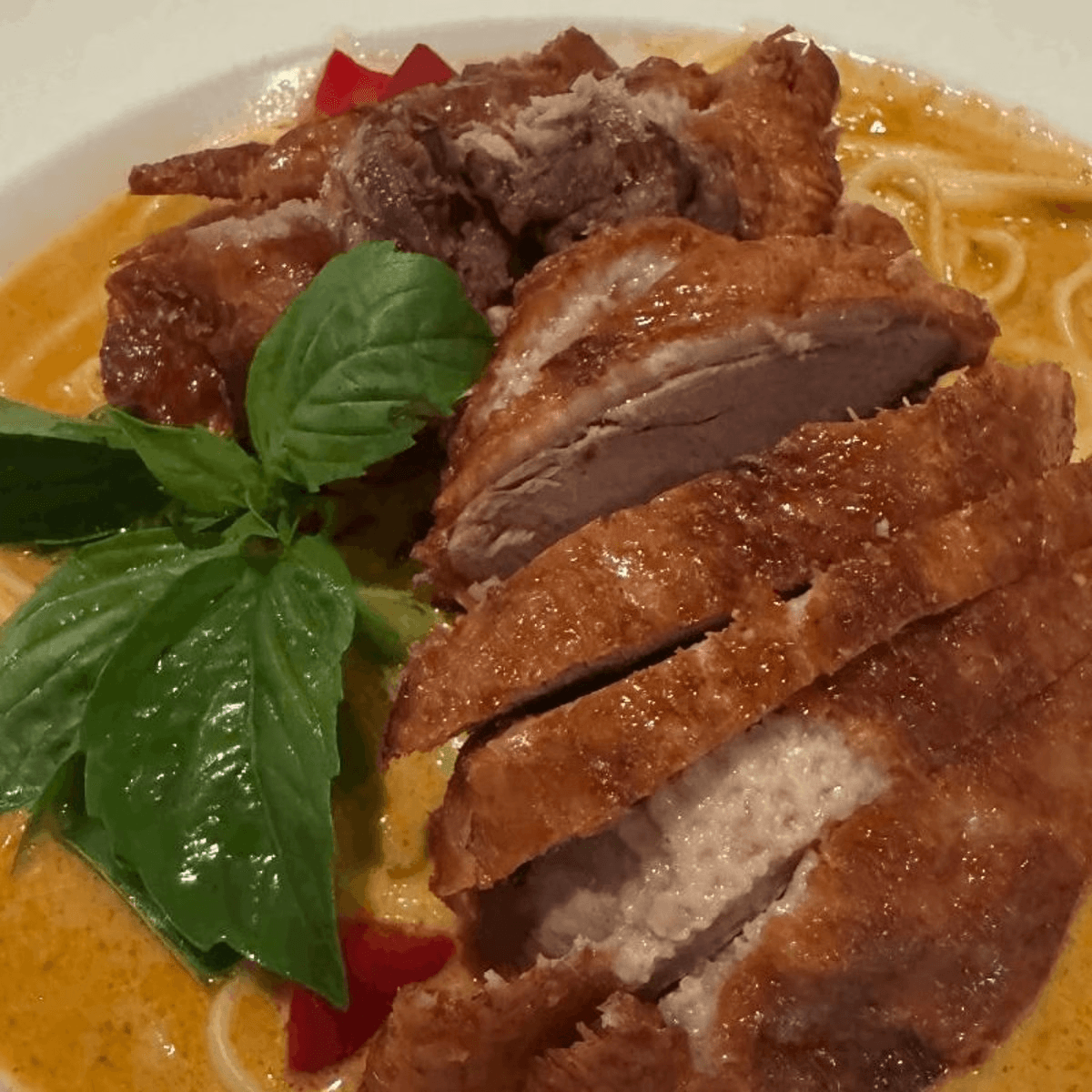 Sliced roasted duck with red curry and linguine pasta, topped with diced bell peppers. Spicy