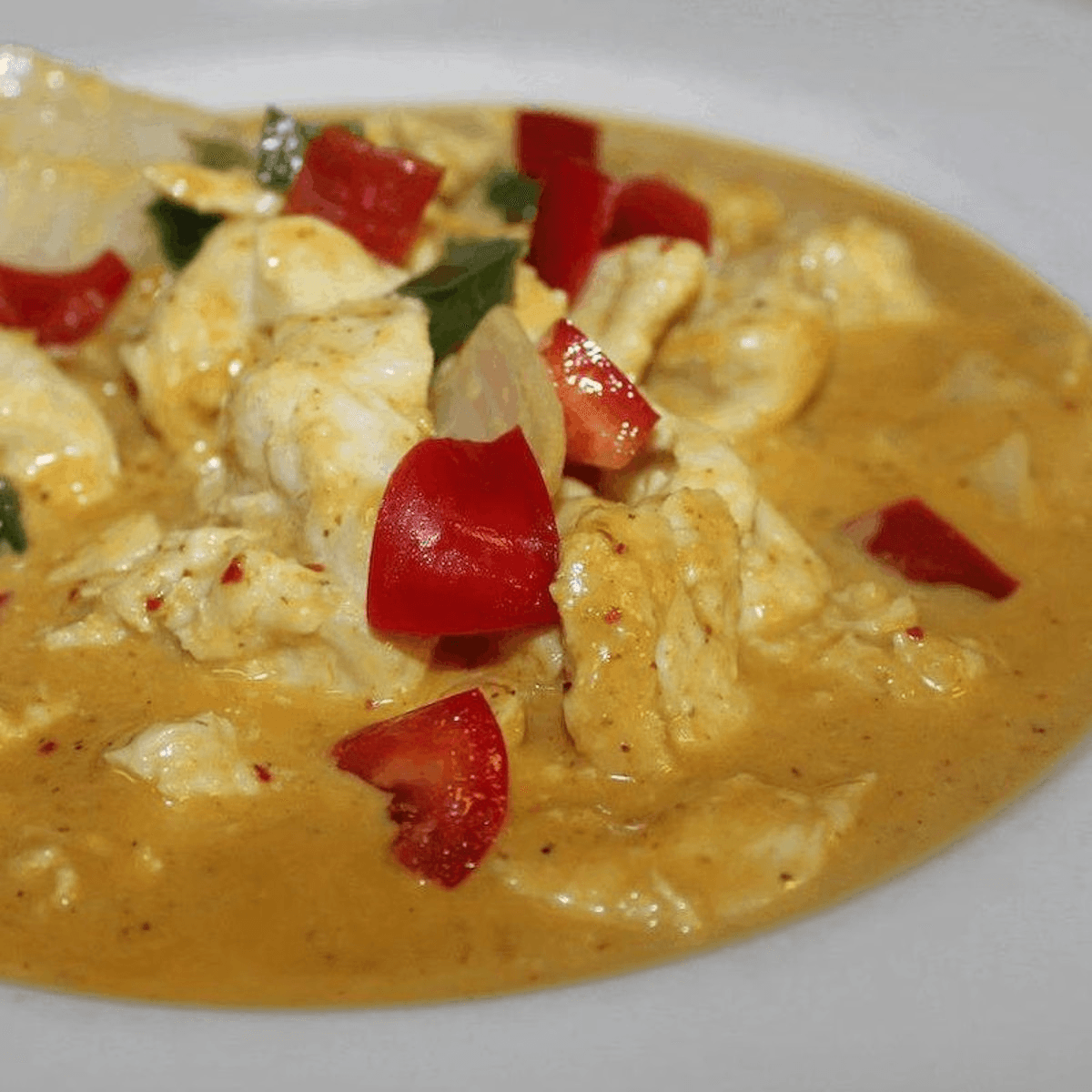 Eggplant, white onions, green beans, Kachai root, bell peppers and sliced filet of catfish. Sautéed with red curry paste sauce