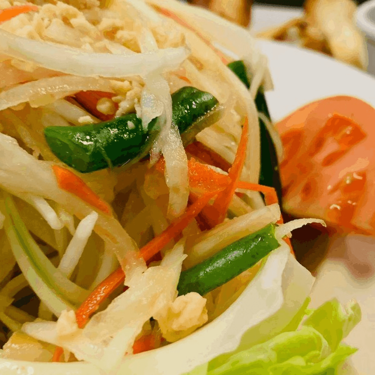 Fresh green papaya, ground peanuts, green beans, carrots and tomatoes, with our house dressing