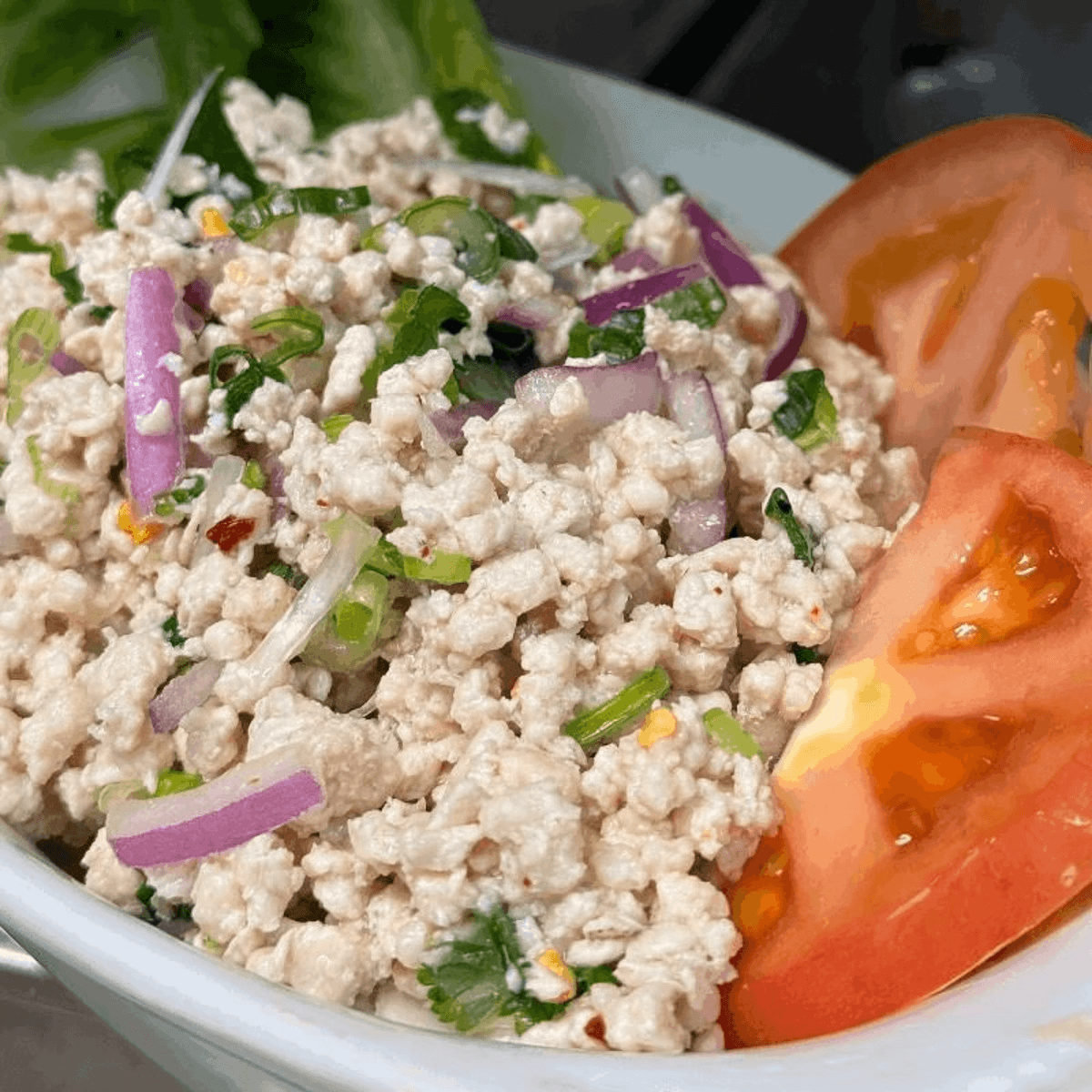 Spicy. Minced chicken mixed with Thai spices, roasted rice powder, spicy lime juice and scallion. Served on fresh lettuce