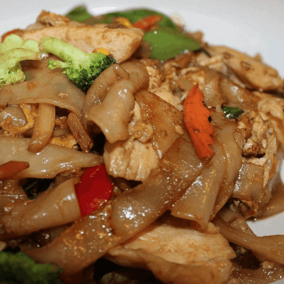 Stir-fried big flat rice noodles with egg, bell and hot pepper, bamboo shoot, broccoli, Carrot peapod, onion, sweet basil.
