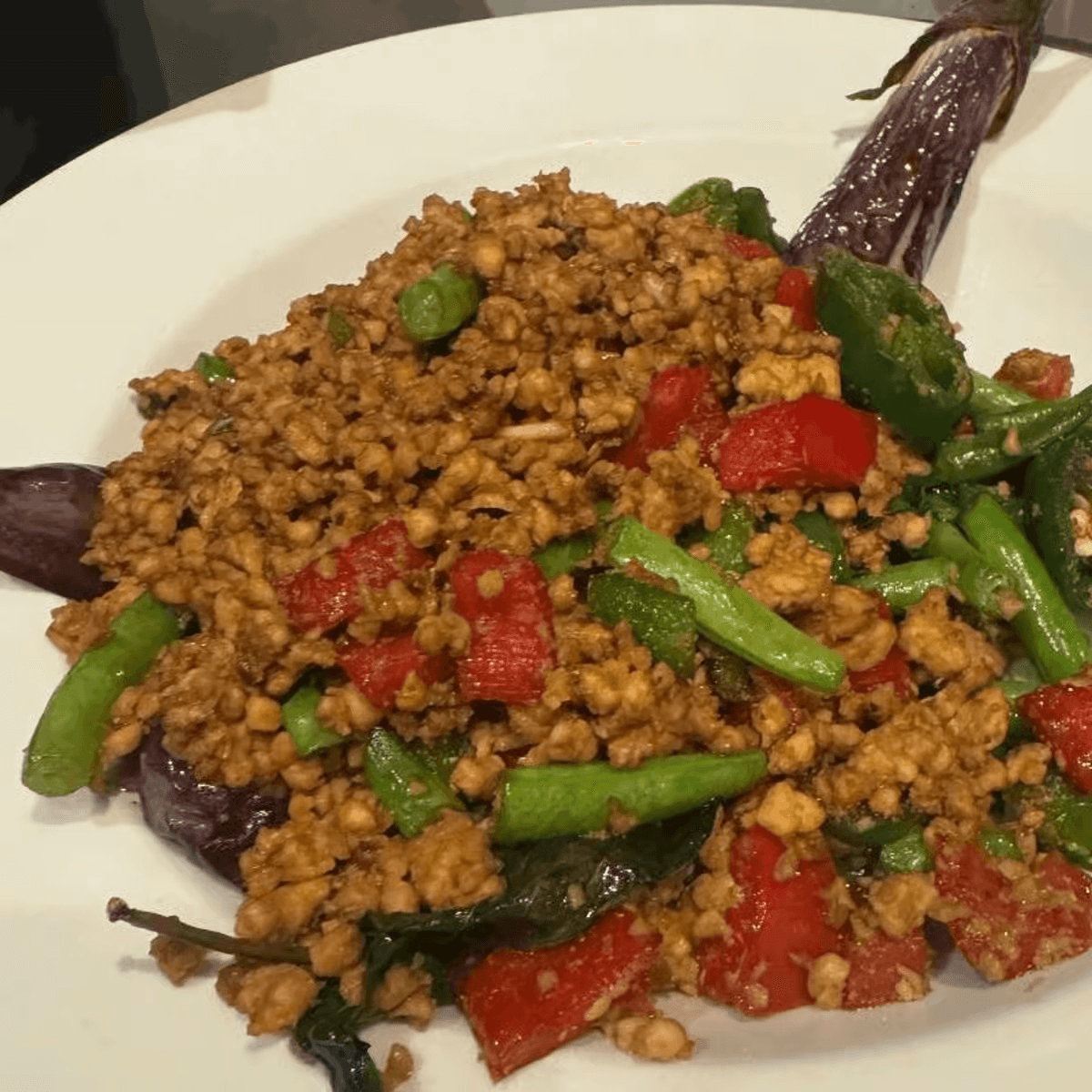Eggplant, basil, jalapeño, bell peppers, green beans and ground chicken. Spicy