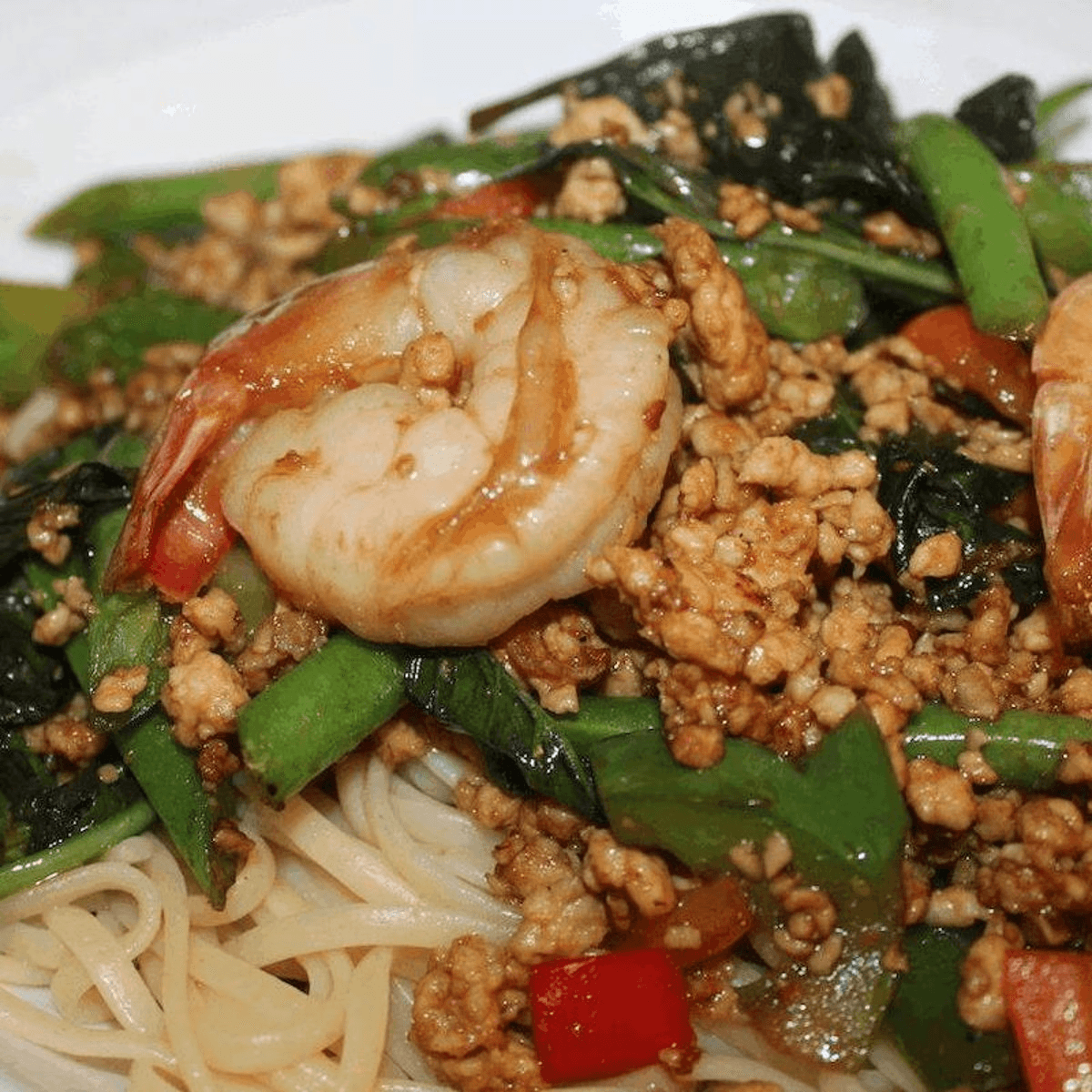 Stir-fried crushed garlic, chili pepper, green beans, diced bell peppers and sweet basil leaves. Spicy. Your choice of: Chicken, pork, tofu, (for additional charge: beef, ground chicken or shrimp)