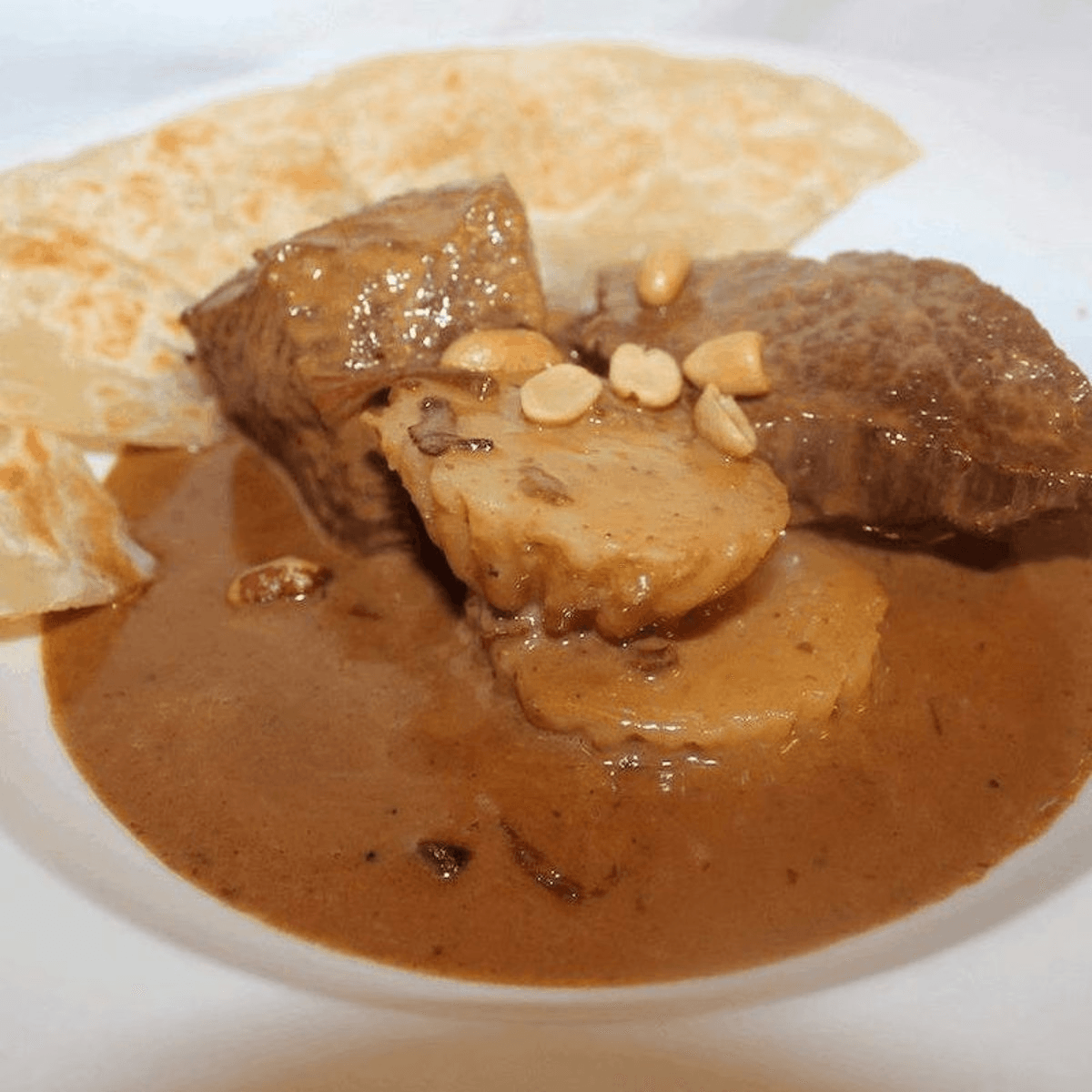 Beef marinated with light peanut curry, very soft and delicate. Spicy. Your choice of: Chicken, pork, tofu; beef, ground chicken or shrimp for additional charge. Served with white rice.