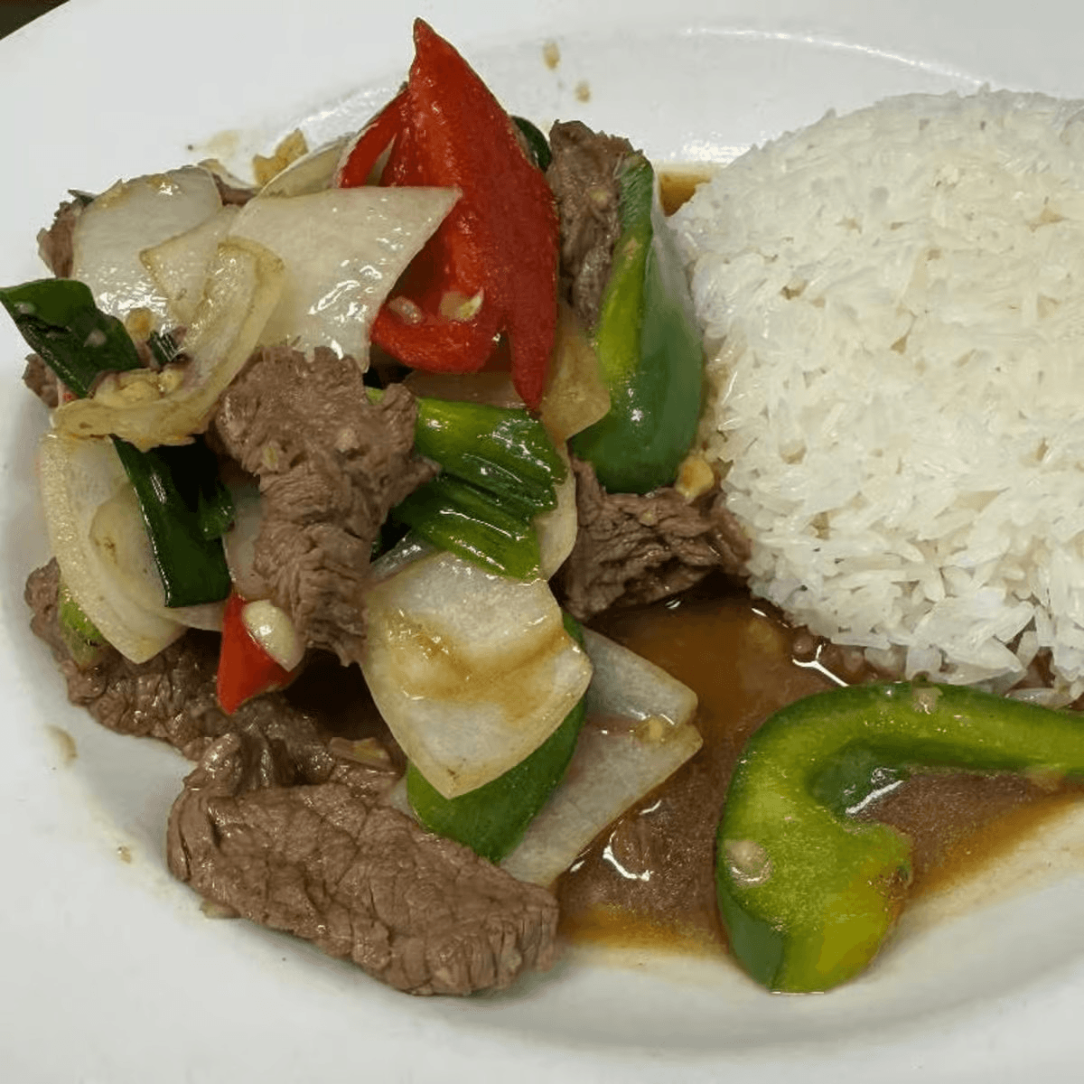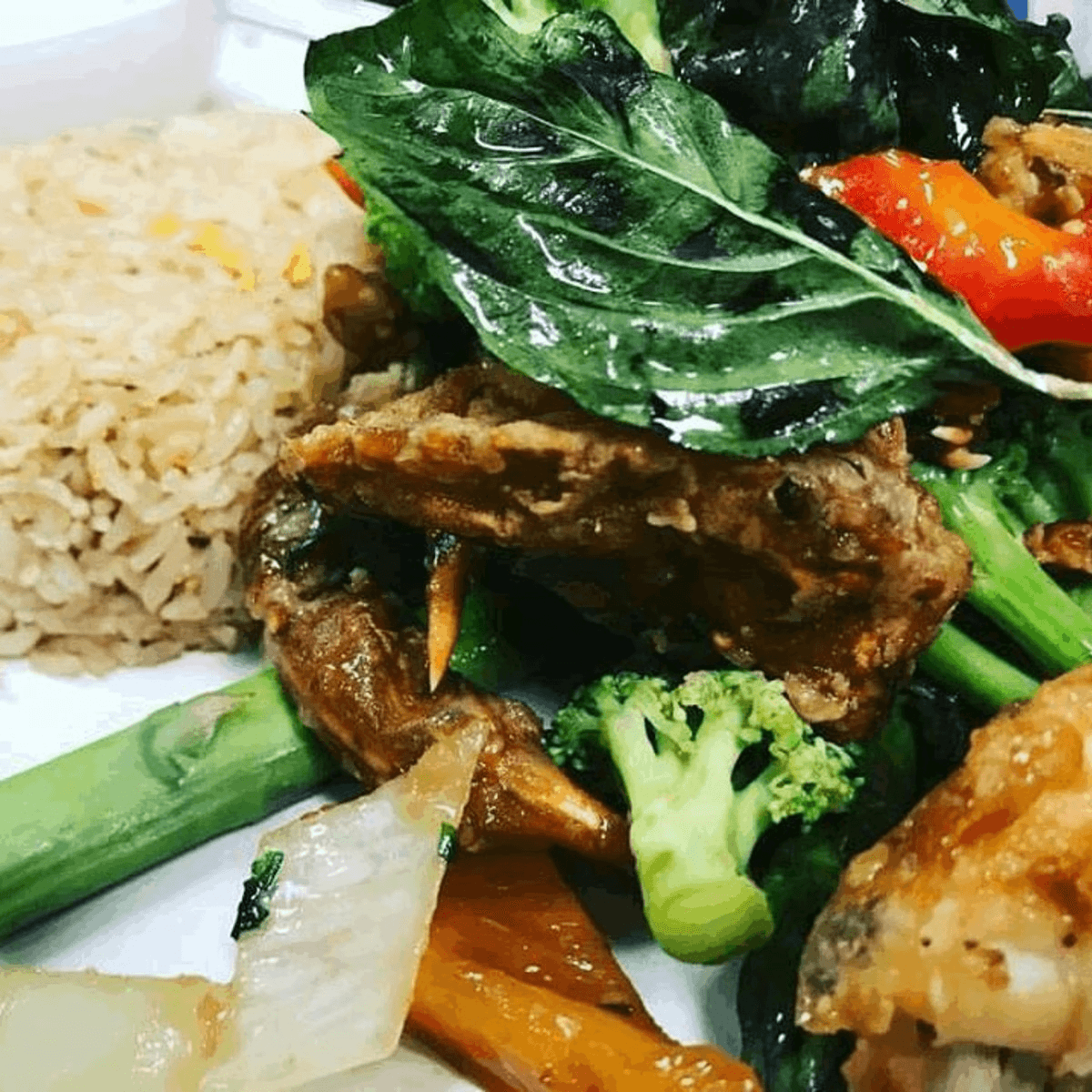 Sautéed your choice of meat with fresh garlic, white onion, and bell pepper in authentic Thai garlic sauce Your choice of: Chicken, pork, tofu, (for additional charge: beef, ground chicken or shrimp)