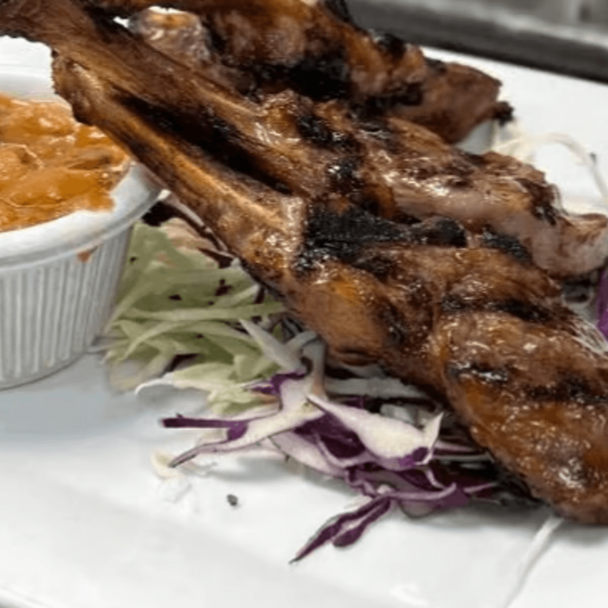 3 pieces. A selected rack of New Zealand lamb marinated with garlic, white peppers and cilantro, grilled to perfection. Served with peanut sauce