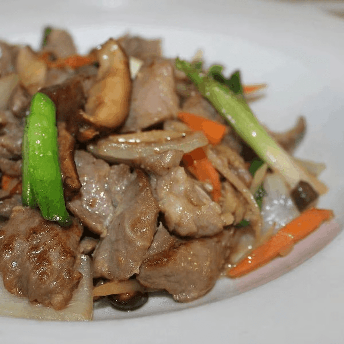 Stir-fried onions, shiitake mushrooms, carrots and sliced ginger in our homemade ginger sauce. Your choice of: Chicken, pork, tofu, (for additional charge: beef, ground chicken or shrimp)