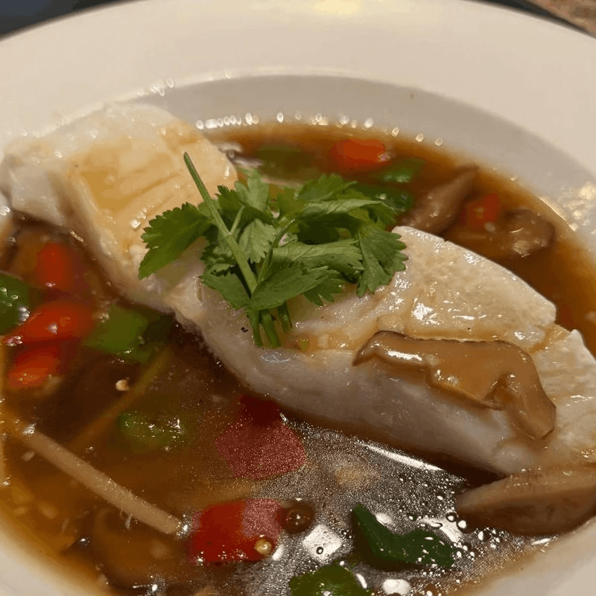 A mignon of Chilean sea bass steamed with house ginger sauce and selected Chinese black mushrooms. Very delicate and tender. Served with white rice